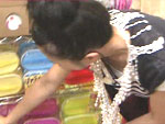 その辺のショップで買い物をする内容で商品を取ろうと屈んだら胸元がパックリ開いて中モロ見えハプニング!