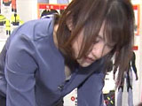 商品紹介のお姉さんが屈んだら胸元の隙間からブラがモロ見えハプニング!