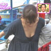| 完全に胸チラ期待の演出か?不自然なところにフリップを置かれ意図的に屈まされる構図の元、案の定屈んだら胸元がパックリ開いてブラモロ見えハプニング! |