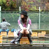 | しゃがんで開いた股間部分を前からパックリショット! |